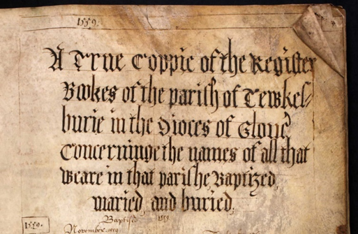 By a happy coincidence the first surviving baptism and marriage records for Tewkesbury in Gloucestershire, the registers of the Parish Church of St Mary the Virgin are from 1559 - just one year after the will of Richard of Tewkesbury and the year in which the original wooden spire, on the top of the church's central stone tower, collapsed. Unfortunatly, as we will see later, the record is not complete and continuous; several years are missing and the burial record does not begin until 1596.