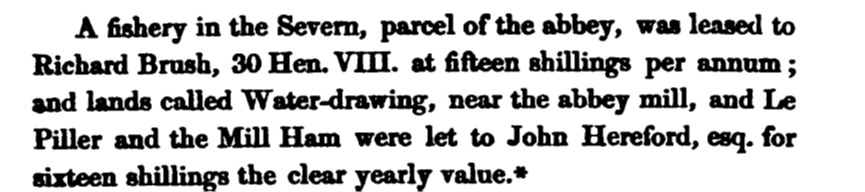 The next reference (which until 2019 was the first reference we had) is in 1542, at the time of the dissolution of the monasteries(3) by Henry VIII when he is recorded in a list of tenants of Tewkesbury Abbey as having a tenancy for 60 years of the wear house and fishery at the Overlode for a rent of 16 shillings. His tenancy is recorded again in 1553. These extracts come from the "Hockaday abstracts" (4) .