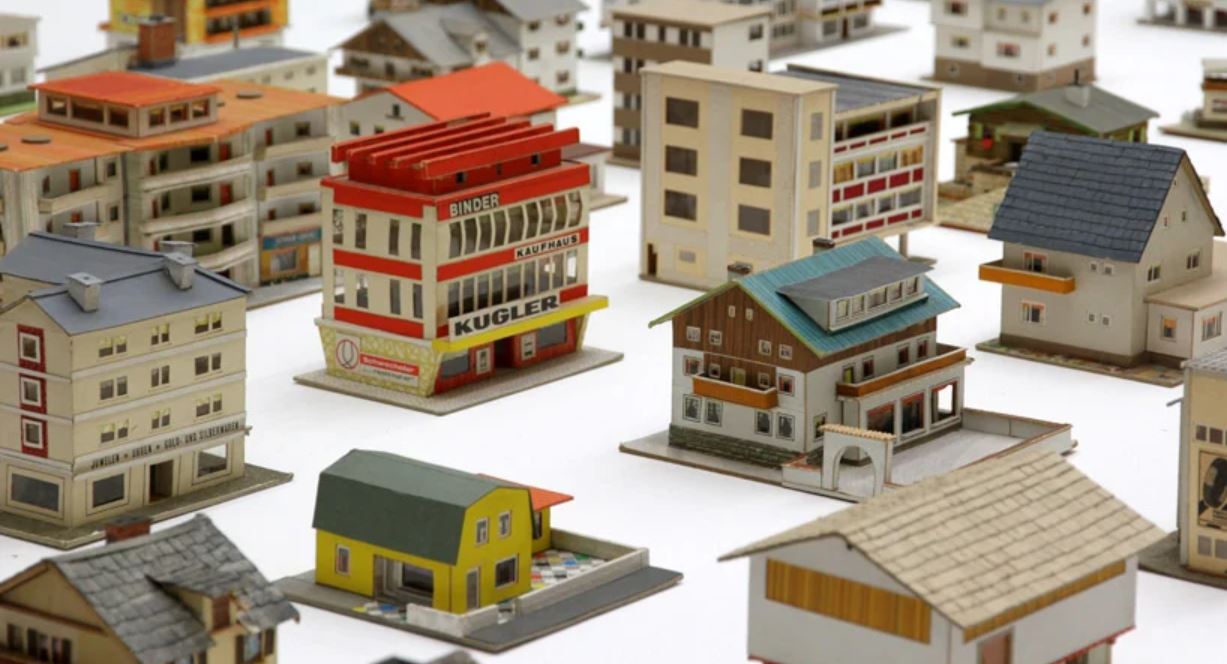 They are described as "a near-encyclopedic inventory of all manner of provincial architectural styles, from farmhouses to bank buildings, churches to traditional single family homes, villas to gas stations..... assembled with care from a combination of easily acquired materials: cardboard, matchboxes, wallpaper scraps, adhesive foil and magazine pages."