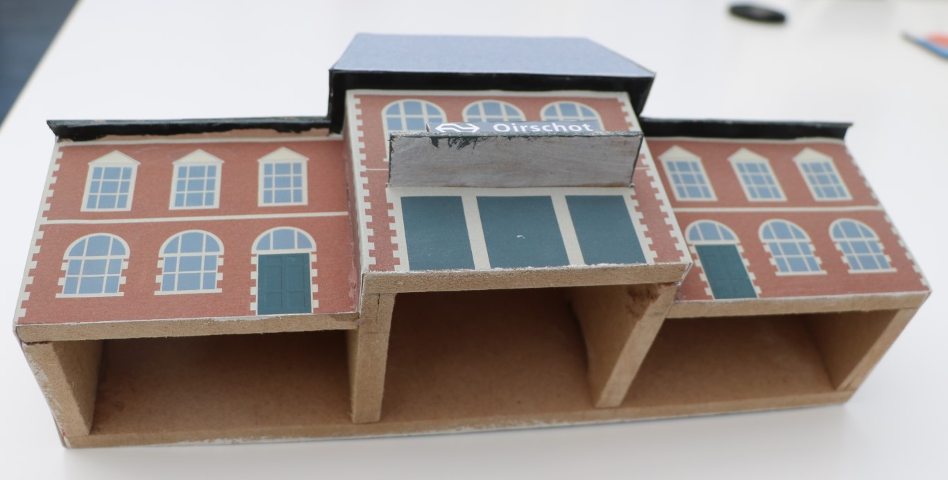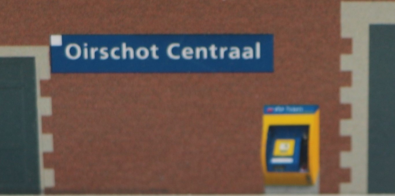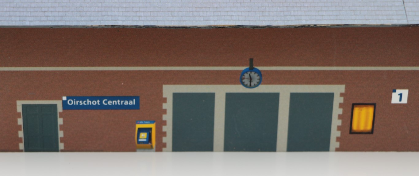 The detailing such as the station name boards, clock, platform number, timetable and ticket machine all came from a variety of online sources, including one site that lets you generate the staion name of your choice in the correct, NS specific, font. (NS is Nederlandse Spoorwegen, the Dutch national rail company) https://www.spoorwegbord.nl/p/8619/spoorweg-bebording/perron-en-stationsborden