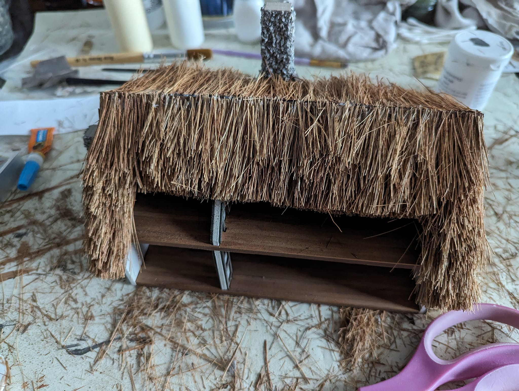 My search for alternatives led me to the model railway engineer site which shares my view that "recreating [thatched roofs] in miniature for a model railway or diorama is incredibly difficult [and that] ... other techniques ... using strands of string or drawing a comb across clay don’t come close to the realistic texture". The author, Andy Leaning, says that "one modeller however has nailed it".
