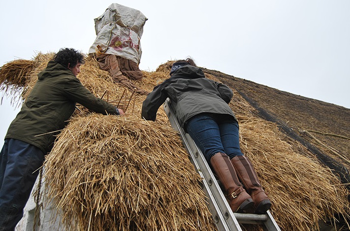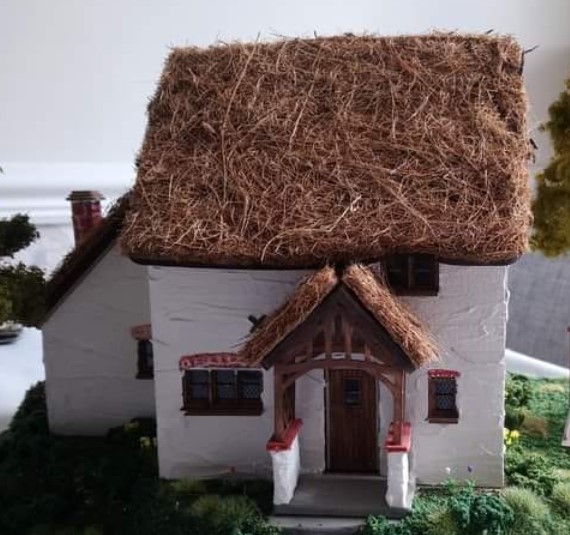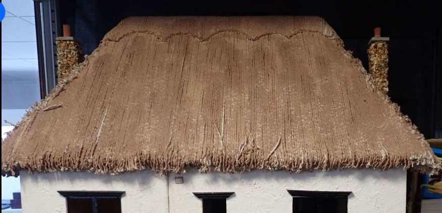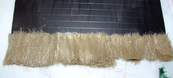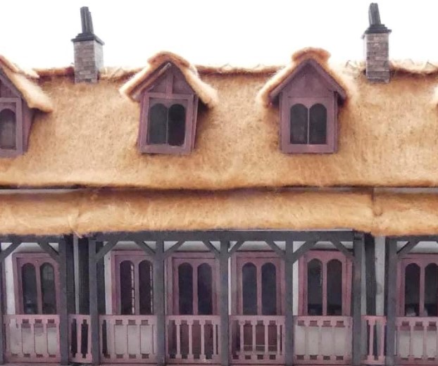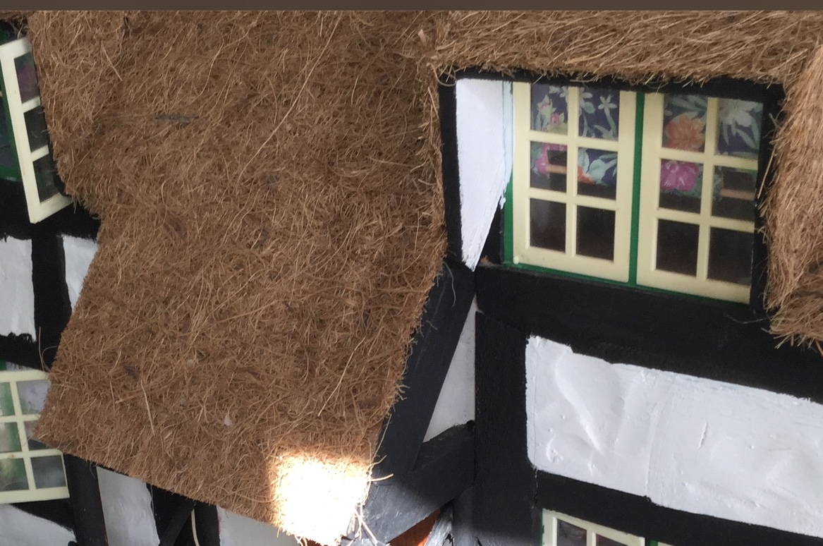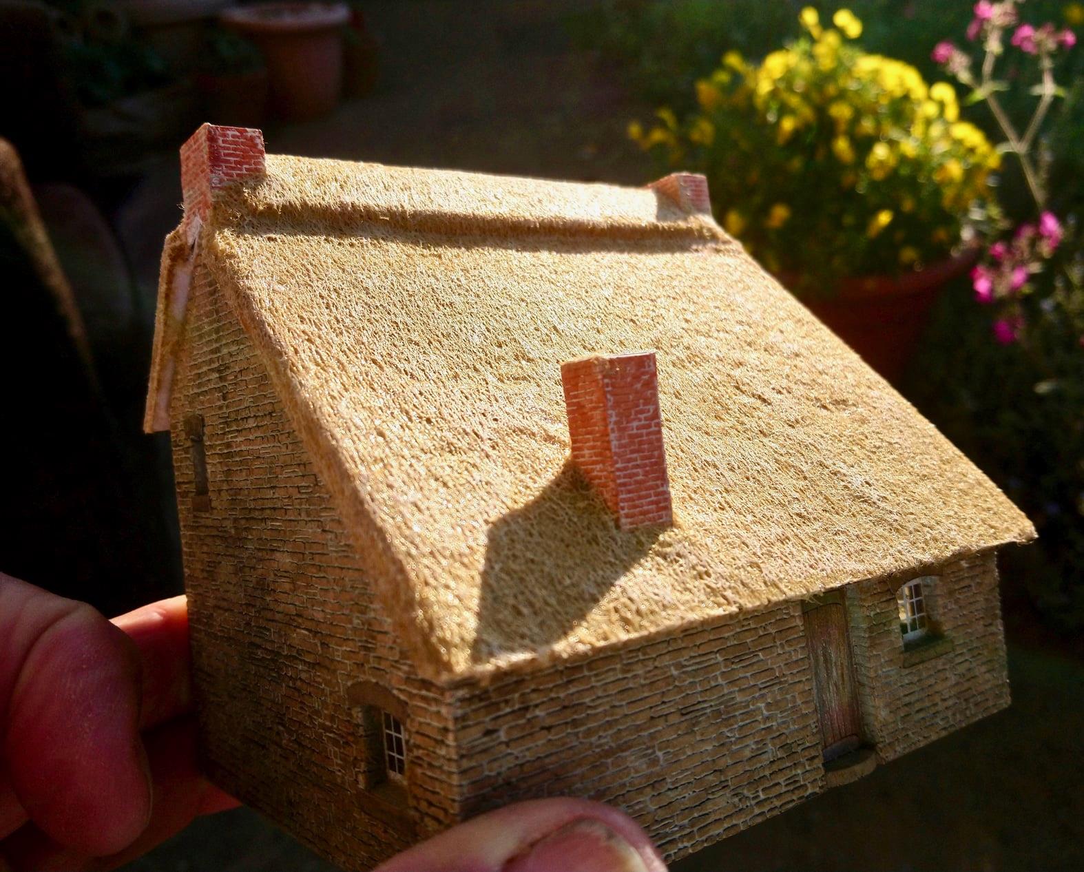 Whether to go for scale or effect is the subject of another article but it seems to me that in this case (and in Ann's plumbers' hemp method) the aim has been neither, but to reproduce in miniature the process of thatching. Watching the thatchers work near me it was noticeable how much time they spent trimming the straw or reeds they were using in order to create a nearly smooth surface.