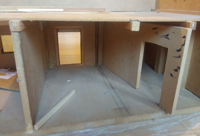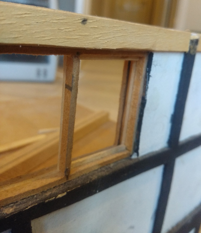 I am quite proud of the windows. Nothing fancy but neat small scale carpentry. Built up in layers. And of the hand crafted herringbone brickwork made of scribed card and hand painted.