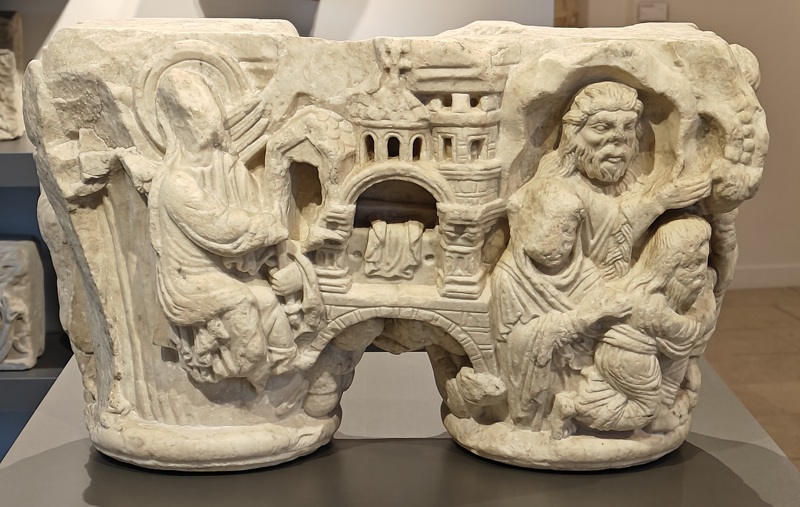 The carving is on an unusual double capital, originally on top of twin pillars, taken from the ancient abbey of St Felix at Valence. It depicts the descent of Christ into limbo.