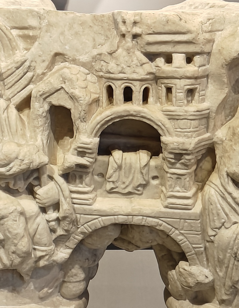 Something very different is the next piece of late 12th century sculpture in Carrera marble. Although well outside the normal range of model buildings it nevertheless includes a reproduction in miniature (half relief) of buildings.