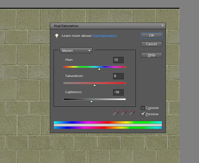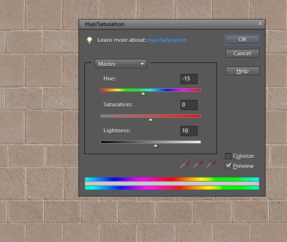 A long time ago a photo was imported of some sampled stonework but the original image is long gone. It has been copied, pasted, overlaid and tweaked to generate the pattern I have now. It has also been recoloured. I love this feature of Photoshop. The ability to darken, lighten, change colour saturation and to increase or decrease the proportion of the basic process colours.