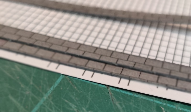 I used the Scalescenes slate texture for this roof. I'm in two minds about it. Although a Scalescenes fan I have two reservations about their slates. To my eye they are just a bit too weathered and varied in colour. And the overlap doesn't feel quite right. For my latest project I am working on some scratch designed slates of my own. Regardless of the source of the texture I have learnt three or four lessons from this and other builds. First is that the slow process of cutting and fixing strips is worth the effort. A simple flat print is OK in my eye for brickwork but for roofs the extra texture of overlapping rows is really needed. At least in 1/87, 1/76 or larger. The jury is still out for 1/144 or other N scales. The second is that applying a grid print first makes so much easier, and the result a better one.