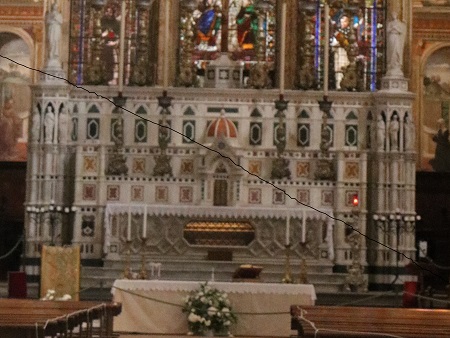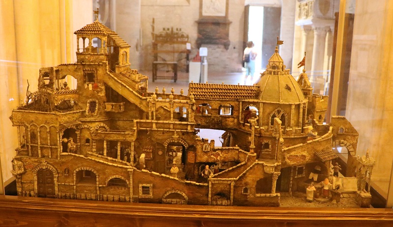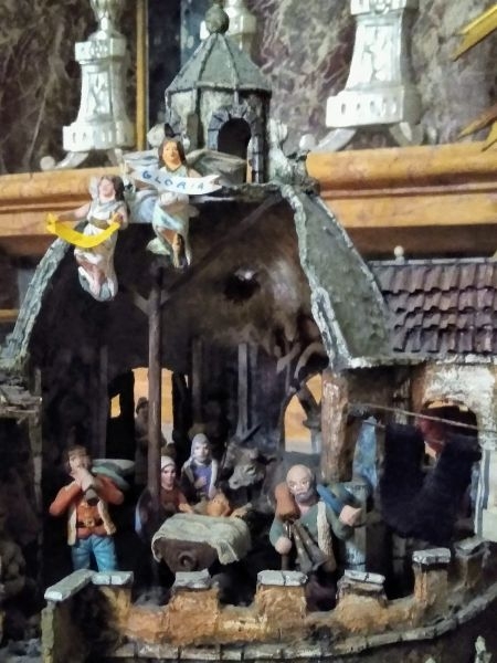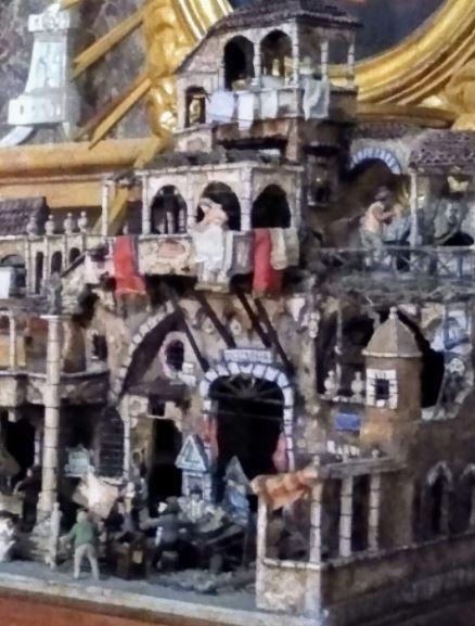 Displayed in the cathedral at Fermo this fantasy building is firmly in a tradition known both in Italy and Southern France of surrounding a nativity scene by an extended village peopled by charecters not just from scripture but also from then contemporay Italian or French life. I discuss these figures a bit more in an article about 'Santons' - the French word for the figures used in these seasonal dioramas.
