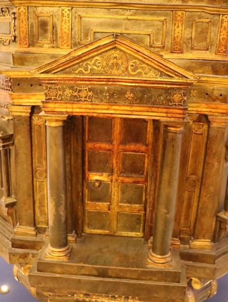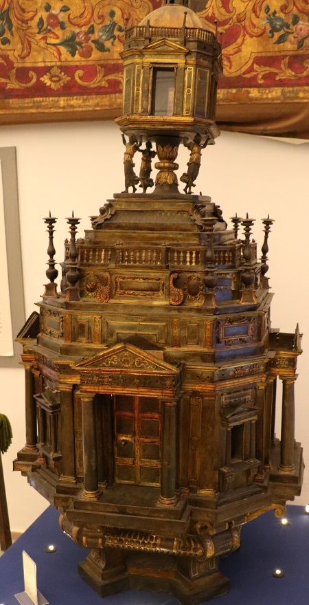 Does the 'tabernacalo' from Perugia count as a miniature building? It is certainly a miniature reproduction of some architectural components, though not I imagine of an actual building. Tabernacle means multiple different things (some of which are certainly buildings) but in this context it is "a small ornamented cupboard or box used for the reserved sacrament of the Eucharist". This example in chiseled, silvered and gilded copper stretches 'small ornamented cupboard' to its limits. It was made in 1571 by Giulio Danti from a drawing by Galeazzo Alessi.